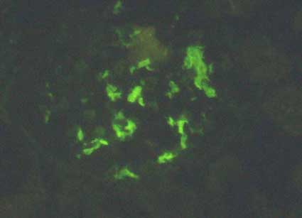 Inmunofluorescencia directa para C1q, X400. Se ve igual en todos los 11