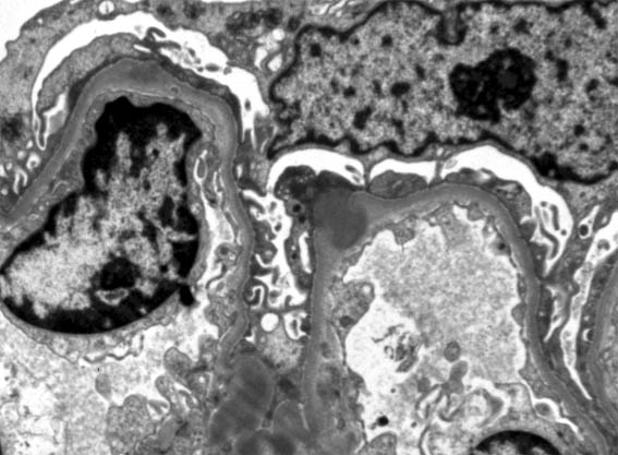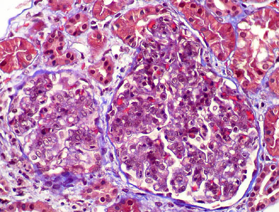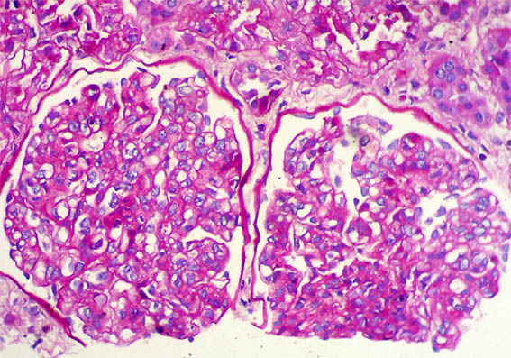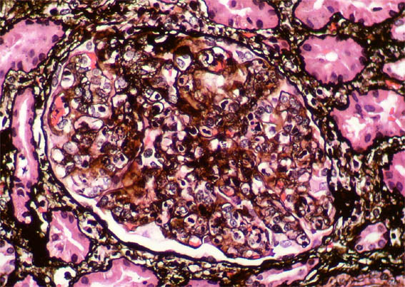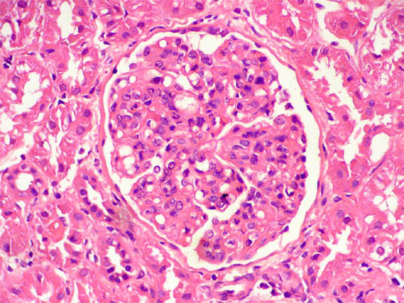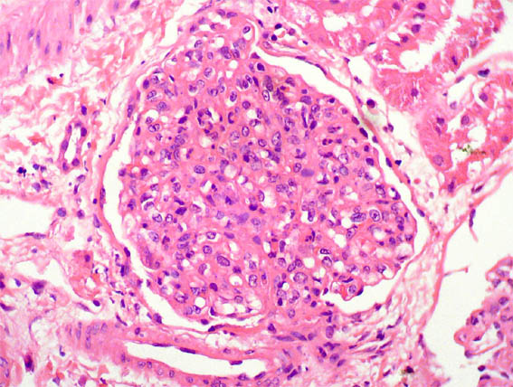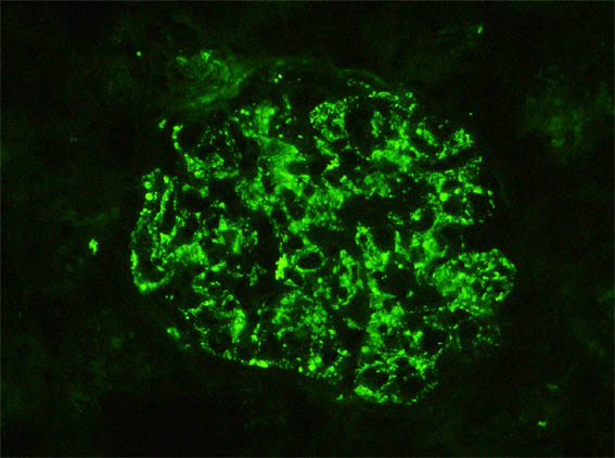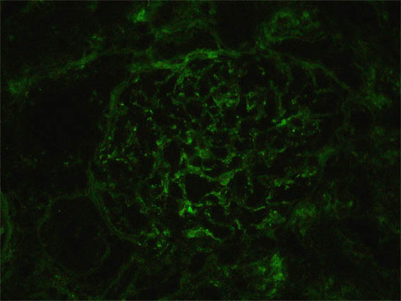 Paraclínicos: Hb: 14 mg/dL, Hto.: 41,5%, leucograma y plaquetas normales. ANAs y anti-DNA: negativos; C3: 62 mg/dL (90-180), C4: 17 mg/dL (10-40). Creatinina sérica: 1,9 mg/dL, BUN: 29 mg/dL. Estudios para virus: negativos. AELOs: 160 U/dL (<200 U/dL). Uroanálisis: eritrocitos: 20-30/CGA; leucocitos: 6-8/CGA, nitritos negativos, proteinuria: 1,7 g/24h.