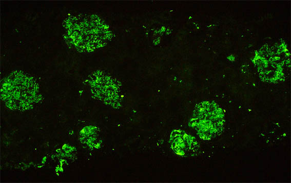Figura 7. Inmunofluorescencia para IgG, X400.