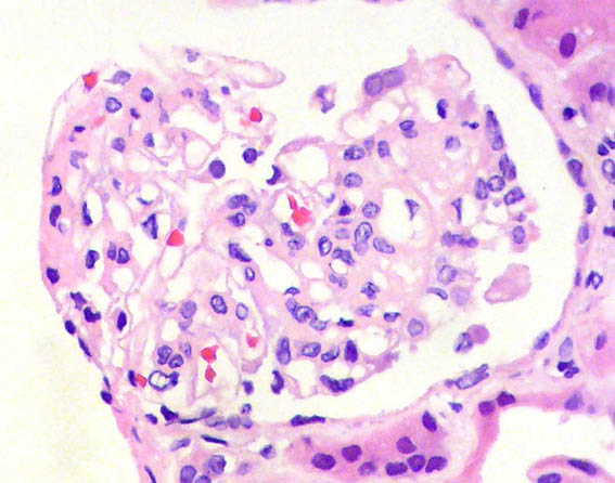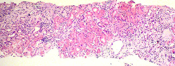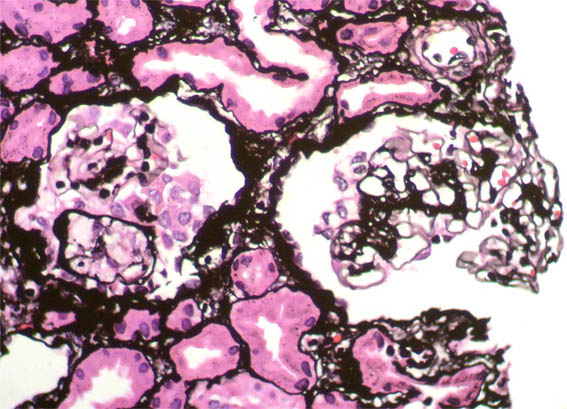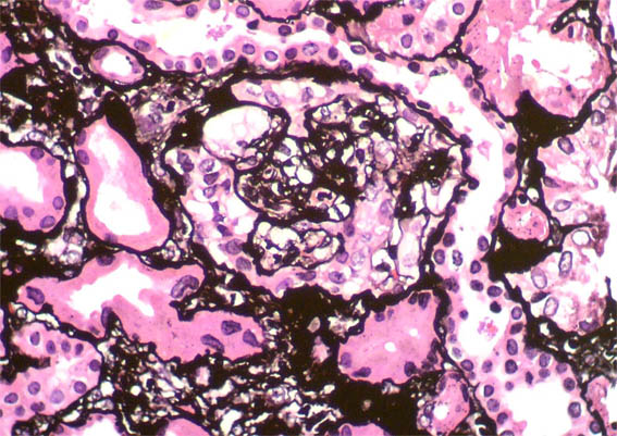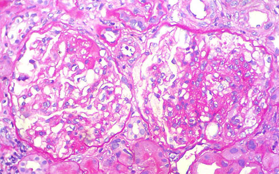 Niño de 9 años de edad, desde los 2 años presenta síndrome nefrótico. No hay otros antecedentes personales y no hay historia familiar de enfermedad renal. Biopsia renal a los 2 años de edad diagnosticada como cambios glomerulares mínimos (no lesiones segmentarias; inmunofluorescencia negativa) (Figuras 1-3). Múltiples recaídas: entre 2 y 3 por año. Desde hace un año corticorresistente. Creatinina sérica hace un año: 0,6 mg/dL, ahora: 1,2 mg/dL. Se hace nueva biopsia renal.