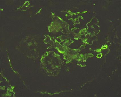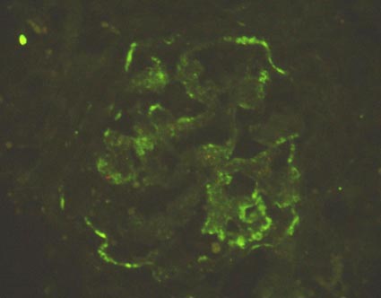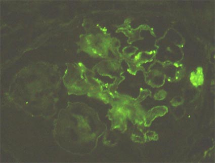 Inmunofluorescencia directa para IgG, X400. La positividad