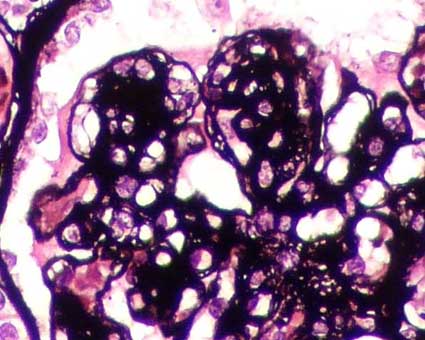 Semilunas epiteliales en 2 de3 8 12 glomérulos.