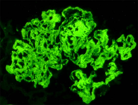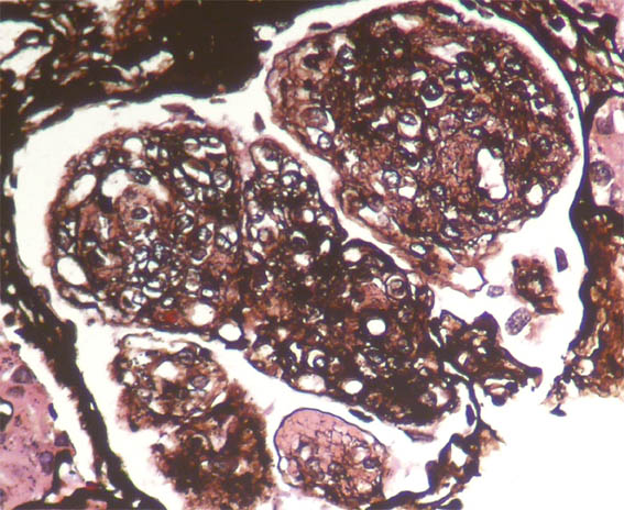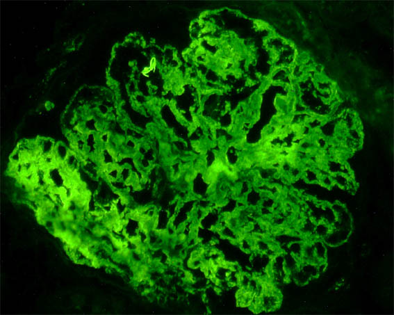 Laboratorio: Hb: 12 mg/dL, Hto.: 37%, plaquetas y leucograma normales. Creatinina sérica: 1,54 mg/dL, BUN: 25 mg/dL, albúmina: 2,9 g/dL. Uroanálisis: proteinuria 500 mg/dL, 9 g en 24 horas, microhematuria. ANAs, anti-DNA y ANCAs negativos. C3: 64 mg/dL (90-10), C4: 22 mg/dL. Estudios para virus: negativos.