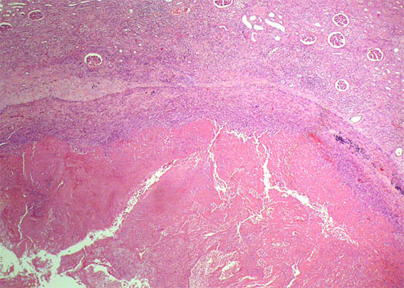 Dadas las dificultades para una posible resección completa de la lesión sin lesionar el hilio, se decidió nefrectomía.