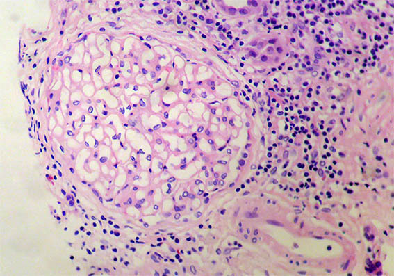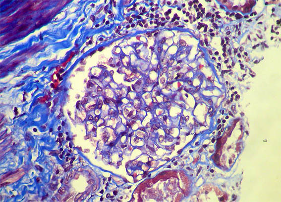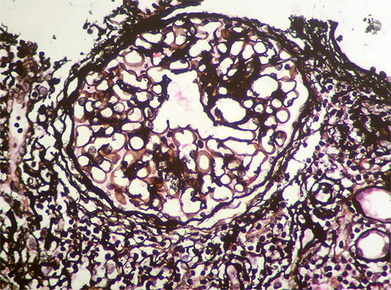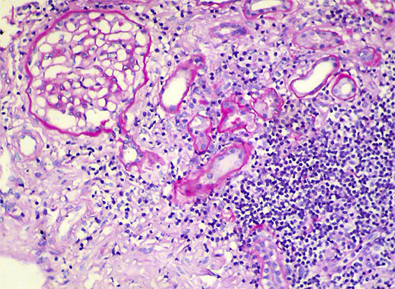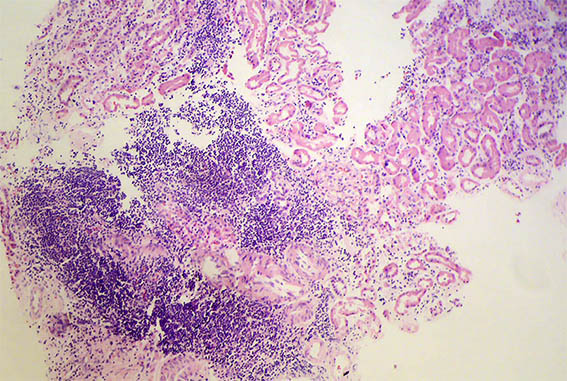 Debido a la alteración de la función renal, proteinuria, microhematuria y leucocituria se ordena biopsia renal:
