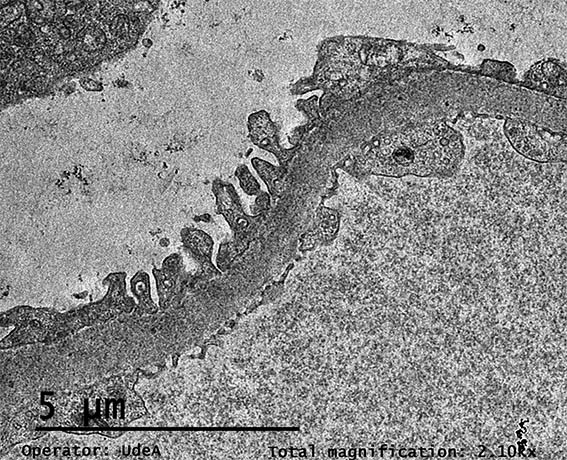 Figura 11. ME, aumento original, X2.100. Procesos podocitarios, membranas basales glomerulares y endotelio normales.