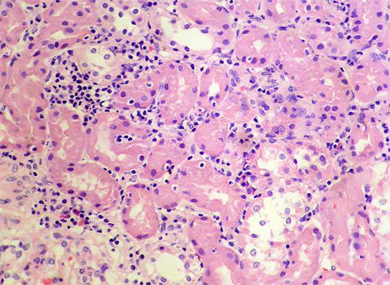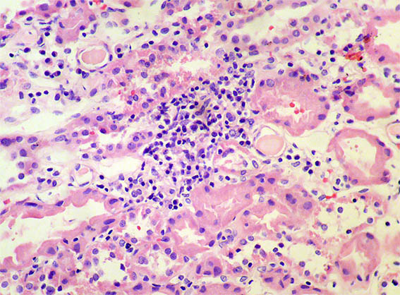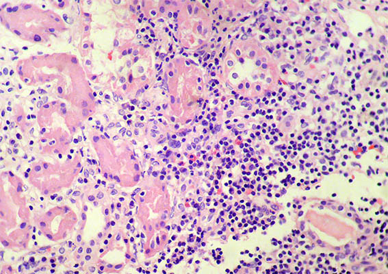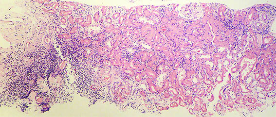 Figura 2. H&E, X100. Marcada inflamación tubulointersticial.