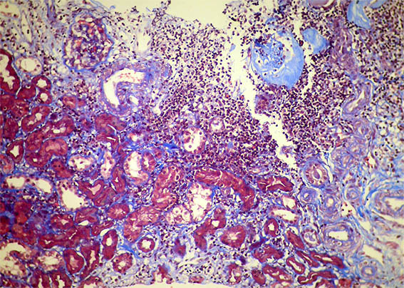 Figura 7. Tricrómico de Masson, X200. Áreas con cambios crónicos.
