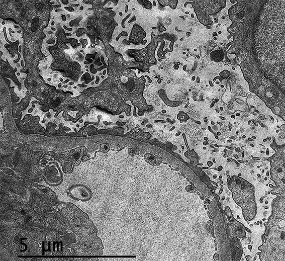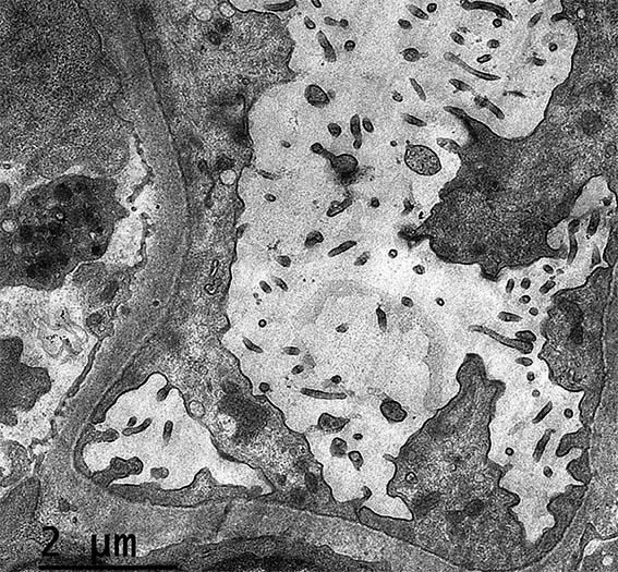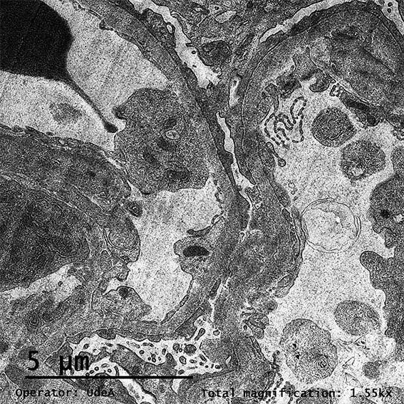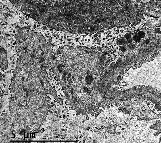 Figura 12. ME, aumento original, X3.000. Inmunofluorescencia directa para IgA, IgG, IgM, C3, C1q: Negativas. ¿Cuál es su diagnóstico? |