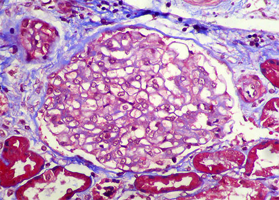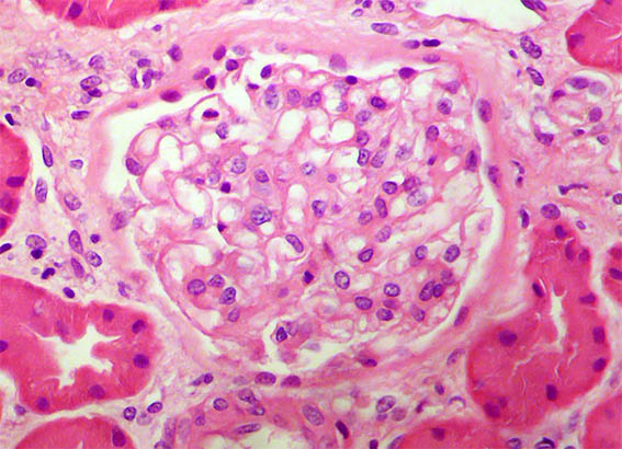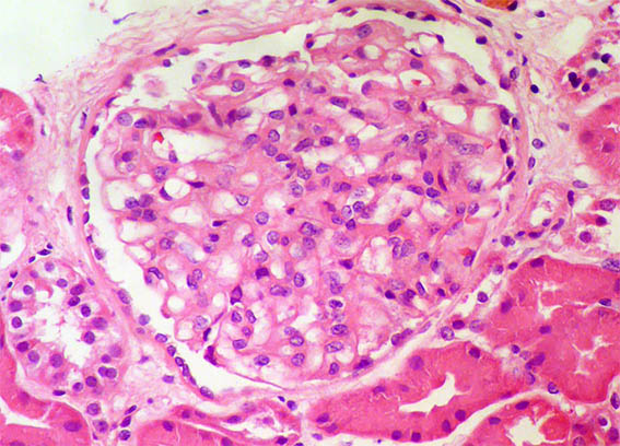 Figura 3. H&E, X400. Quizá algo de aumento segmentario, inespecífico, de la celularidad mesangial.