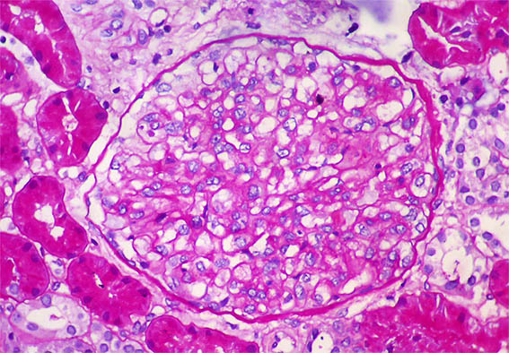Figura 4. PAS, X400. Sin alteraciones. No hay lesiones esclerosantes o hialinas en ninguno de los 22 glomérulos de la biopsia.