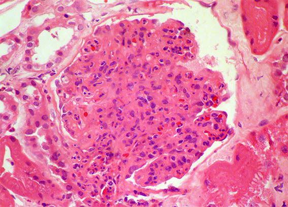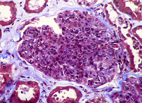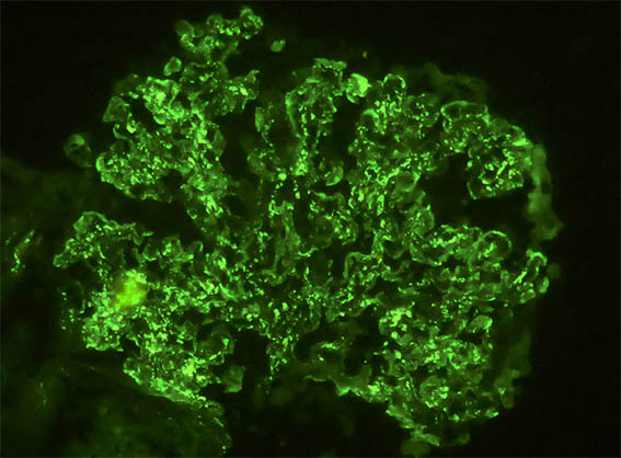 Un hombre de 58 años presentó trauma por caída en bicicleta con fractura de tibia y peroné, la cual fue tratada quirúrgicamente, presentando semanas después infección de la herida quirúrgica, además elevación de la craetinina sérica: 1,9 mg/dL, con microhematuria y proteinuria de 2,3 g/24 horas. Complemento sérico: C3: 52 mg/dL (88-180), C4: 15 mg/dL (12-39). ANAs, anti-DNA y ANCAs: negativos. VIH y virus hepáticos: negativos.