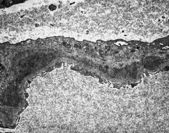 Figura 9. Microscopía electrónica, aumento original, X4.000. Observe el depósito grande, subepitelial, en la parte central de la imágen. ¿Recuerda cómo denominan a este tipo de depósito?