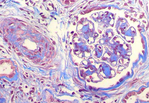Inmunofluorescencia directa para cadenas ligeras Kappa, izquierda, X200;