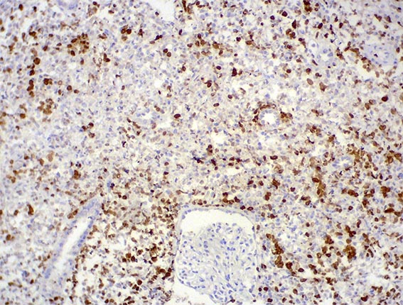 CASO 113 Volver a datos clínicos e imágenes Caso 113 Diagnóstico: Compromiso renal por linfoma difuso de células B La inmunohistoquímica demostró positividad difusa para CD20 y CD10, con índice proliferativo del 80% (Ki67). Caso diagnosticado por la sección de Hematopatología de nuestro Departamento. Figura 7. Inmunohistoquímica para CD20, X400.