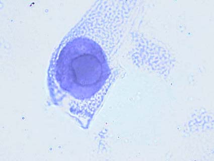 Figure 9. Célula con una inclusión intranuclear bien definida que no ocupa todo el núcleo. Observe el aspecto del citioplasma. Papanicolau, X600. Nuestro caso demuestra una ambigüedad algo frecuente en nefritis asociada a BKV: la presencia de tubulitis, lo que plantea la posibilidad de un rechazo tubulointersticial concomitante. Es posible que la infección origine este tipo de lesión inflamatoria, pero puede ser también que exista rechazo, con el consiguiente dilema terapéutico. Hay consenso en que si se evidencian lesiones arteriales de rechazo (tipo II o tipo III de Banff), glomerulitis o depósitos de C4d en capilares peritubulares debemos diagnosticar un rechazo concurrente. El diagnóstico de rechazo tubulointersticial, sin embargo, es más complicado en este contexto ya que la tubulitis podría ser una respuesta a antígenos virales o a necrosis de celulas inducida por el virus. La demostración de infiltrados linfocitarios, marcada tubulitis y expresión de HLA-DR en túbulos en áreas sin inclusiones virales respalda el diagnóstico de rechazo. En estos casos el diagnóstico debería ser de rechazo además de la nefritis asociada al virus. En pacientes diagnosticados con rechazo agudo concurrente debe considerarse tratamiento anti-rechazo seguido por reducción de la inmunosupresión dos semanas después (Hirsch et al. Transplantation. 2005 [PubMed link]. Fibrosis y esclerosis del injerto, mucho tiempo después del trasplante, podría ser causada por el virus, aunque ya no se demuestren las inclusiones. El virus es citopático para las células tubulares y lleva a destrucción tubular, permaneciando sólo las basales de los túbulos. En ocasiones el diagnóstico será sólo posible por la revisión de biopsias previas. El proceso puede ser clínicamente silente: biopsias de protocolo han mostrado una incidencia subclínica del 1,2%. Además, el BKV puede afectar los riñones nativos de pacientes con trasplante de otros órganos; sólo se han documentado unos pocos casos, pero es posible que esto se deba a falta de biopsias renales en este contexto. Otro aspecto nuevo en la infección por BKV es que puede causar depósito de complejos inmunes en la membrana basal tubular. Esta característica fue descrita en 43% de casos en una serie de Seattle y fue la causa más común de depósitos de IgG en las membranas basales tubulares de injertos renales ( referencia 42 en: Colvin RB, Cornel LD. Current Diagnostic Pathology, 2007 [Full text link]). En la inmunofluorescencia hay positividad focal, granular, para IgG, C3 y C4d y hay depósitos amorfos electron-densos en la microscopía electrónica. El significado pronóstico de estos hallazgos no se conoce, pero es poco probable que sean benéficos o que no sean perjudiciales. Estos depósitos no marcan para el antígeno T grande del BKV por técnicas de inmunohistoquímica (Colvin RB, Cornel LD. Current Diagnostic Pathology, 2007 [Full text link]). Los depósitos pueden persistir después de que los antígenos virales se han hecho indetectables, por lo que podría ser que el BKV genere una respuesta autoinmune contra antígenos tubulares. Ver infección por Poliomavirus en el capítulo: Patología del trasplante renal parte 3.