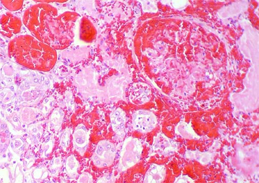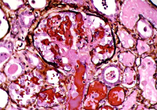 Rechazo agudo mediado por anticuerpos (sospechoso para o presuntivo) Los criterios diagnósticos básicos del rechazo mediado por anticuerpos (RMA) - o rechazo humoral - son la demostración de C4d en capilares peritubulares e inflamación y/o lesión tisular (Terasaki P, Mizutani K. Clin J Am Soc Nephrol. 2006;1(3):400-3. [PubMed link] [Free full text]). Aun así, de acuerdo con la clasificación de Banff para el rechazo del aloinjerto renal (2007), el diagnóstico definitivo requiere la "demostración de anticuerpos anti donante circulantes"; casos en los que sólo se encuentren dos de los tres criterios se consideran "sospechosos de" RMA. Los tres criterios son: Evidencia morfológica (lesión tubular aguda, neutrófilos y/o células mononucleadas en capilares peritubulares y/o glomérulos y/o trombosis capilar, necrosis fibrinoide o inflamación transmural o intramural en arterias), evidencia inmunopatológica (depósitos de C4d o inmunoglobulinas en capilares peritubulares) y evidencia serológica (anticuerpos anti donante). Se han definido tres formas de lesión mediada por anticuerpos: Rechazo hiperagudo, rechazo humoral agudo y rechazo humoral crónico. Una cuarta "forma de rechazo" ha sido propuesta por el Dr. Robert B. Colvin: "acomodación" (i.e. función renal normal con histología normal o cambios menores, y depósitos de C4d en capilares peritubulares). Los pacientes con RMA agudo presentan disfunción del injerto que a menudo empieza en las primeras semanas post-trasplante y no es clínicamente distinguible del rechazo agudo mediado por céulas T. El RMA agudo puede también desarrollarse años después del trasplante, a menudo asociado a disminución de la inmunosupresión. La presensibilización es el principal factor de riesgo, pero muchos de los pacientes con RMA tienen cross-match negativos. El RMA se ha presentado con cualquiera de los esquemas de inmunosupresión, aún aquellos que conllevan a deplección severa (Colvin RB. J Am Soc Nephrol. 2007;18(4):1046-56. [PubMed link] [Free full text]). La biopsia renal puede mostrar también signos de rechazo celular agudo, lesión tubular aguda o microangiopatía trombótica (como en nuestro caso). En el caso que presentamos el compromiso vascular es evidenciado también por necrosis hemorrágica del parénquima (ver la Figura 11, abajo). Con la tinción de plata metenamina se ven mejor los microtrombos (Ver Figura 12, abajo).