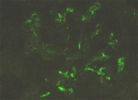 hematuria. Normal serum complement levels. ANAs and ANCAs negative. Tests