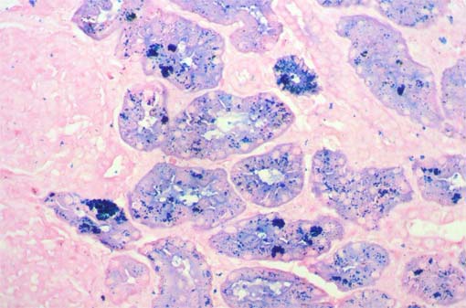 Figure 9. Iron stain (positivity is blue), X400.