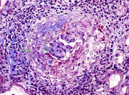 Figura 5. En este glomérulo podemos ver el penacho deformado y con un área de fibrina y fragmentación de núcleos (cariorrexis) (flechas verdes) que indican necrosis segmentaria del penacho. Hay una semiluna circunferencial epitelial, son un área evolucionando a fibroepitelial (parte superior izquierda de la circunferencia glomerular). Las flechas rojas señalan el penacho capilar comprimido. El infiltrado inflamatorio mononuclear es prominente alrededor de este glomérulo; este severo infiltrado se asocia con ruptura de la cápsula de Bowman. En algunos casos podremos evidenciar granulomas periglomerulares que no indican granulomatosis de Wegener. (Tricrómico de Masson, X400).