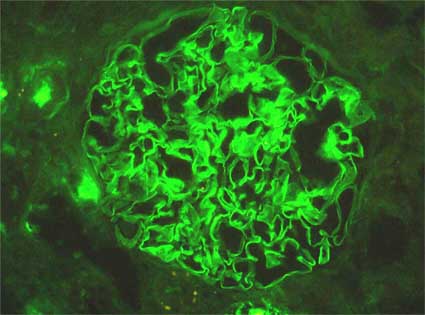 Figura 7. Inmunofluorescencia para IgG en un caso de síndrome de Goodpasture en un hombre de 29 años. Observe la tinción lineal en las paredes capilares. La inmunotinción para C3 puede mostrar un aspecto similar, pero suele ser menos intensa. (Inmunofluorescencia directa para IgG, anticuerpos anti-IgG humana marcados con fluoresceina, X400).