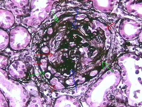 Figura 3. En las semilunas fibroepiteliales podemos ver una mezcla de células grandes, con núcleo redondeado, activo, muchas veces con nucléolo prominente y citoplasma amplio, que se mezclan con tejido fibroso o colágeno que resalta con la tinción de plata (como en esta foto) y con la tinción de tricrómico. Las flechas azules señalan el penacho comprimido y distorsionado, las rojas señalan células grandes, activas, que indican que aún hay proliferación epitelial, y las verdes la fibrosis que está reemplazando muchas áreas de esta semiluna, indicando un proceso que evoluciona a la cronicidad. (Plata-metenamina, X400).