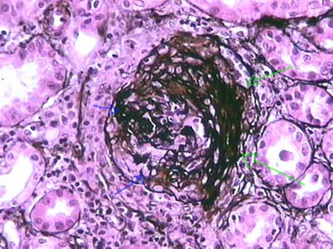 Figura 4. Al avanzar el proceso destructivo del glomérulo la semiluna se hace más fibrosa (o cicatricial) y las células que la componían disminuyen progresivamente hasta desaparecer, siendo reemplazadas por fibroblastos. Las tinciones de plata y tricrómico resaltan el componente fibrosos (flechas verdes), en este caso sin componente epitelial; las flechas azules señalan lo que queda del penacho glomerular. (Plata-metenamina, X400).