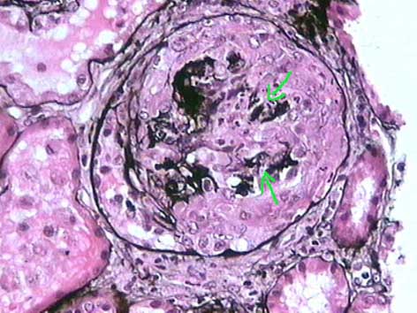 Figura 2. En las semilunas epiteliales las células que proliferan no se acompañan de tejido fibroso o colágeno. La plata resalta el penacho comprimido y con ruptura de paredes capilares (flechas), este daño capilar es un fenómeno patogénico importante en la generación de la proliferación extracapilar. (Plata-metenamina, X400).