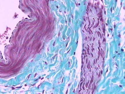 Figura 4. Las tinciones en las que se resalta el colágeno permiten identificar mejor el tejido intersticial. Aquí se ve de color verde, rodeando una arteria (izquierda) y un nervio (derecha). (Tricrómico de Gomori, X300).