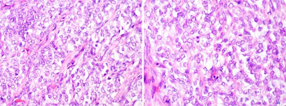 Figura 30. En este caso hay disposición menos densa de las células y un patrón algo hemangiopericitoide. (H&E, X400).
