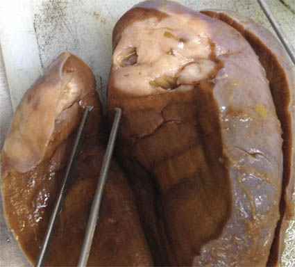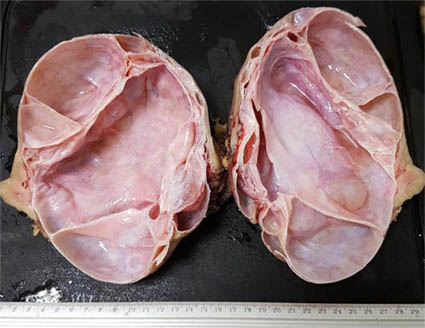 Figura 38a. Imágenes macroscópica característica de nefroma mesoblástico congénito. Este caso corresponde al de un niño de 4 meses de edad, con diagnóstico de masa renal desde el segundo mes de vida.