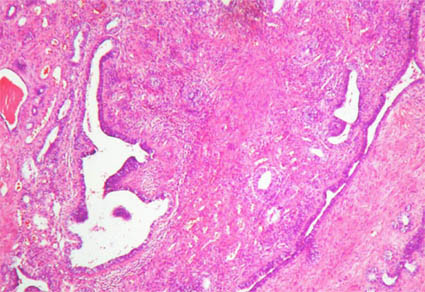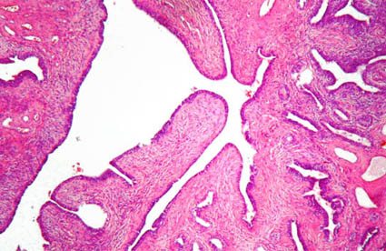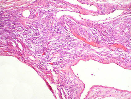 Figura 31b. Las paredes están formadas por un estroma fusocelular benigno. La microscopía electrónica. Las cavidades pueden estar tapizadas por epitelio simple que puede verse plano, cúbico o en "tachuela" (H&E, X100).