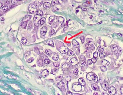 Figura 38. Esta imágen fue obtenida de un campo en un carcinoma convencional de un paciente de 59 años. Hay células rabdoides (flecha), con núcleos de alto grado. En algunos casos este cambio rabdoide es extenso, haciendo plantear la posibilidad de un tumor rabdoide. En mayores de 5 años de edad, no debemos pensar en tumor rabdoide, sino, en carcinomas con áreas rabdoides. (Tricrómico de Gomori, X400).