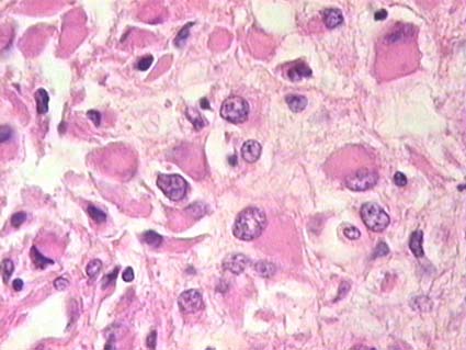 Hallazgos microscópicos: Hay un crecimiento sólido de una población de células grandes, monótonas, poco cohesivas, con núcleos grandes y excéntricos, con nucléolos prominentes y citoplasma eosinofílico abundante que contiene una típica inclusión hialina grande que desplaza el núcleo; estas inclusiones no las vemos en todas las células, pero, son prominentes y fáciles de encontrar. Con el patrón clásico pueden combinarse otros patrones: esclerosante, epitelioide, fusiforme, linfomatoide, vascular, pseudopapilar y quístico.