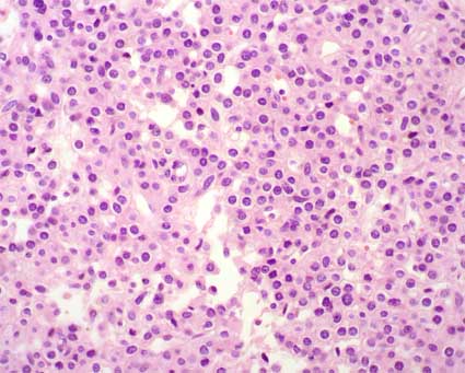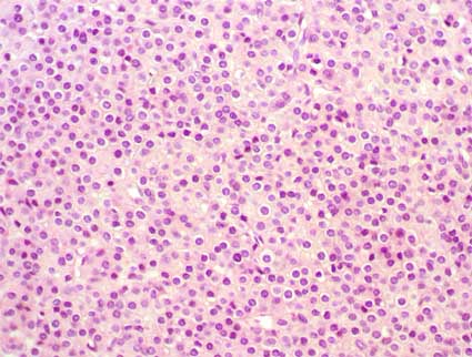 Figura 29. Tumor de céluas yuxtaglomerulares. Hay una disposición sólida de células con limites bien definidos, núcleos centrales, redondos, homogéneos, sin o con muy escasas mitósis. En algunas áreas hay disposición en nidos de las células tumorales, algo similar a carcinoides. (H&E, X400).