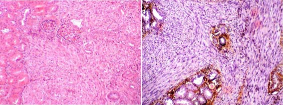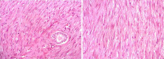 Figura 38c. A mayor aumento vemos el aspecto fibromatoso de la lesión, con poco pleomorfismo y englobando túbulos (izquierda). Igual caso que la figura anterior. Ambas imágenes: H&E, X400.