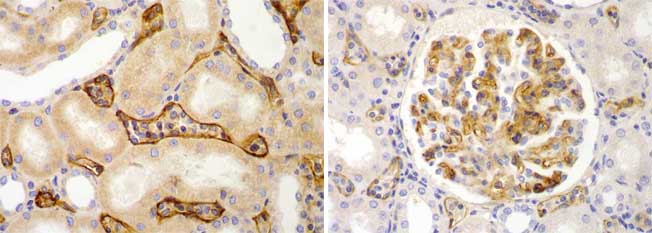 Figura 3. La inmunotinción para C4d se considera positiva cuando se detecta en paredes de capilares peritubulares (CPT). La positividad en capilares glomerulares es menos específica. En ambas microfotografías hay positividad en CPT; en la izquierda se ve más intensa porque usamos una concentración más alta del anticuerpo anti-C4d; observe bien en la imágen de la derecha, la marcación de algunos CPT. (Inmunoperoxidasa para C4d, X400).