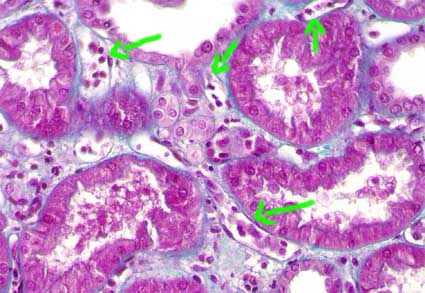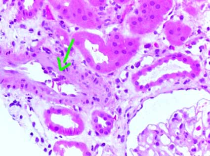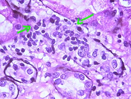 2. Neutrófilos y/o mononucleares en capilares peritubulares y/o glomérulos