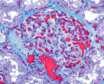 Figura 2. En el mismo caso de la imagen anterior, teñido con tricrómico, podemos ver los trombos intracapilares en glomérulos y capilares peritubulares; hay leve distorsión de la arquitectura del penacho y algunos polimorfos intraluminales. (Tricrómico de Masson, X400).