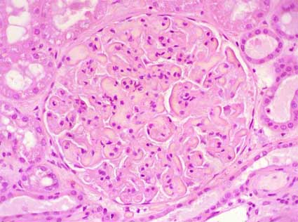 Figura 1. Glomérulo en el que se evidencia congestión capilar severa, microtrombos y polimorfos intracapilares. Observar este tipo de lesiones en todos, o casi todos los glomérulos, es muy sugerente de rechazo hiperagudo. En casos de lesiones por preservación (e isquemia - reperfusión), las lesiones suelen ser más focales y menos severas. En trombosis venosas no solemos ver la extensa marginación de capilares que vemos en estos casos. Nefrectomía de paciente con rechazo hiperagudo. (H&E, X400).
