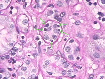 Figura 8. La tubulitis se carcateriza por infiltración de linfocitos al epitelio tubular. Las tinciones en las que se resalta la membrana basal tubular permiten observar mejor la presencia de los linfocitos dentro del epitelio. Es muy frecuente que estas células inflamatorias se vean rodeadas de un espacio claro que las resalta (flechas). La severidad de la tubulitis se gradúa de acuerdo al número por área transversal del túbulo, en este caso 5 linfocitos: t2. (PAS, X400).