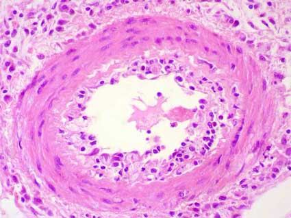 Figura 4. En rechazo agudo acelerado es característico encontrar rechazo vascular. En caso de respuesta inmune severa contra el endotelio podemos ver trombosis arterial. En esta arteria, a la izquierda, hay también infiltración de células inflamatorias en la pared y fragmentación nuclear (cariorrexis). (H&E, X300).