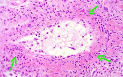 Figura 12. Las lesiones arteriales severas (v3) se carcaterizan por inflamación transmural de arterias o, como en este caso, necrosis fibrinoide de la pared. Hay infiltrado inflamatorio con cariorrexis y material eosinofílico (fibronoide) en casi toda la circunferencia de esta arteria de mediano calibre. Las flechas señalan las zonas con lesión más prominente. (H&E, X400).