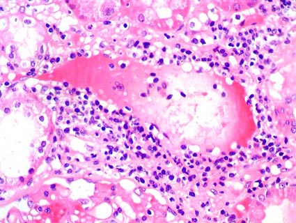 Las alteraciones principales están en túbulos, intersticio, arterias y venas, y consisten en grados variables de inflamación con infiltración de linfocitos activados (se ven más grandes, con nucléolo y con cromatina más granular: abierta, contrario a los pequeños y de cromatina densa, oscura con las tinciones de rutina).