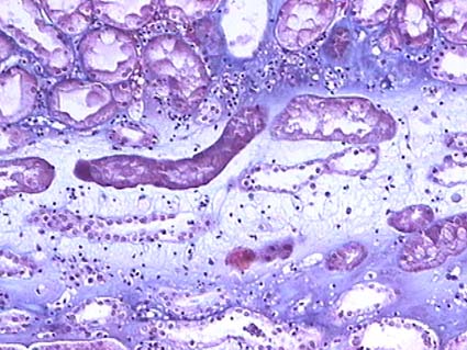 Figura 7. La inflamción intersticial en rechazo se caracteriza por infiltrado de linfocitos activados; en muchos casos podemos ver, también, marcado edema del intersticio. Observe el estroma laxo, fibrilar, edematoso, separando los túbulos, en un caso de rechazo agudo tubulointersticial severo, tipo IB de Banff. (Tricrómico de Masson, X300).