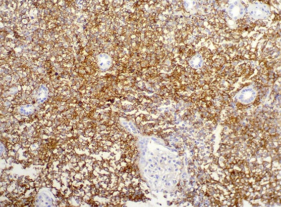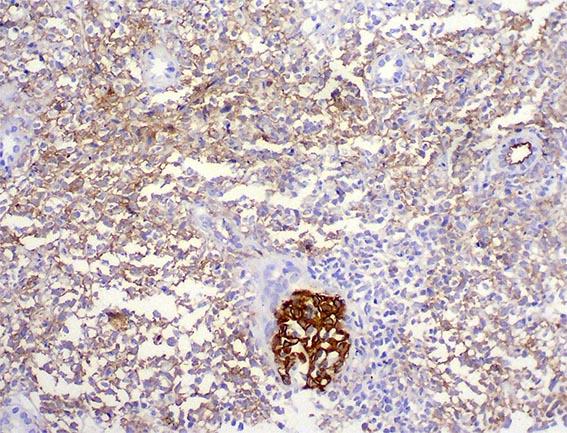 CASO 113 Volver a datos clínicos e imágenes Caso 113 Diagnóstico: Compromiso renal por linfoma difuso de células B La inmunohistoquímica demostró positividad difusa para CD20 y CD10, con índice proliferativo del 80% (Ki67). Caso diagnosticado por la sección de Hematopatología de nuestro Departamento. Figura 7. Inmunohistoquímica para CD20, X400.