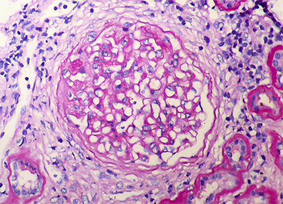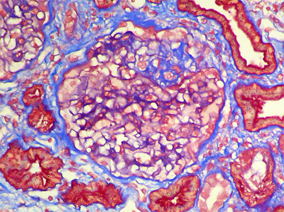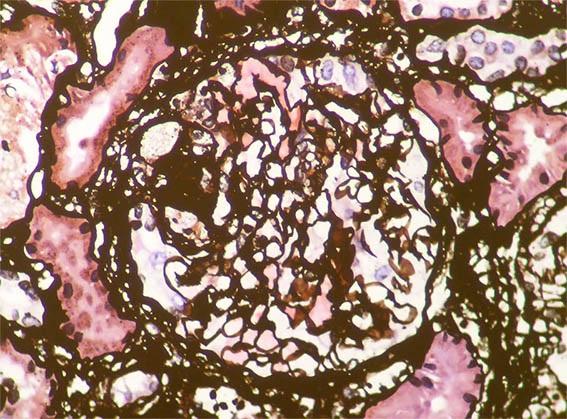 he first months after post-transplantation the paraclinics were normal. At the 5th month, proteinuria of 0.8 g/day was detected, without hematuria and with normal creatinine. At the 7th month after post-transplantation, proteinuria was 6.2 g/day, he presented edema in the lower limbs, dyslipidema, and serum albumin of 2.6 g/dL. Serum creatinine 1.0 mg/dL, BUN: 14 mg/dL.