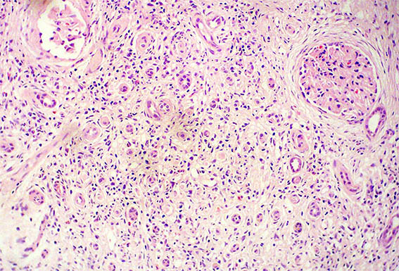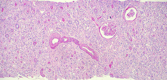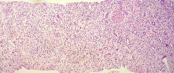 Figure 1. H&E, X100. Note the prominent tubulointerstitial involvement.
