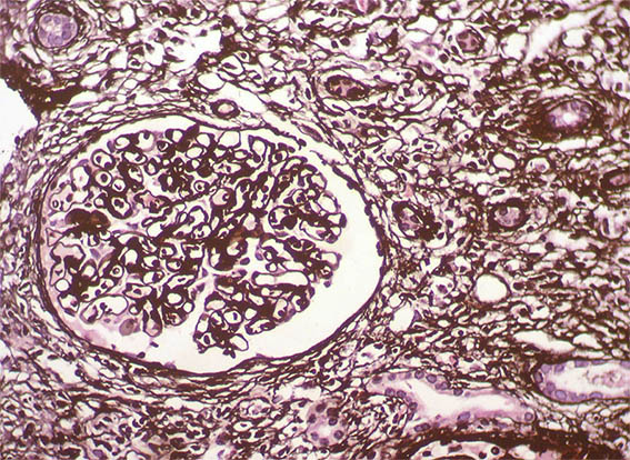 Negative autoimmunity studies, except for a mild decrease in C3 serum levels: 84 mg/dL (90-180), C3: 20.2 (12-40), with negative ANAs and anti-DNA. Normal liver biochemistry. Negative virus studies. PTH: 110 pg/mL, APS profile: negative. Electrophoresis without monoclonal peak. LDH: normal; erythrocyte sedimentation rate (ESR): 120 mm/h. By ultrasound: enlarged kidneys, with poor corticomedullary differentiation. Proteinuria: 700 mg/24h, in the sediment 3 erythrocytes/hpf, leukocytes: 6/hpf. Inguinal, periaortic, and retroperitoneal lymph nodes are documented.