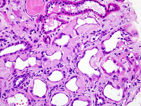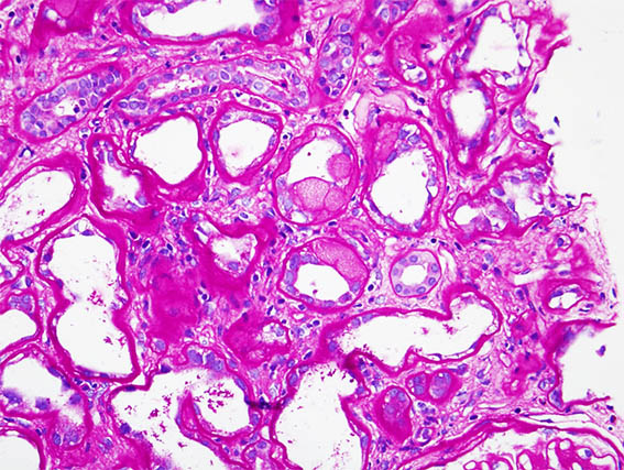 Figure 1. H&E, X400. Note the tubular material.